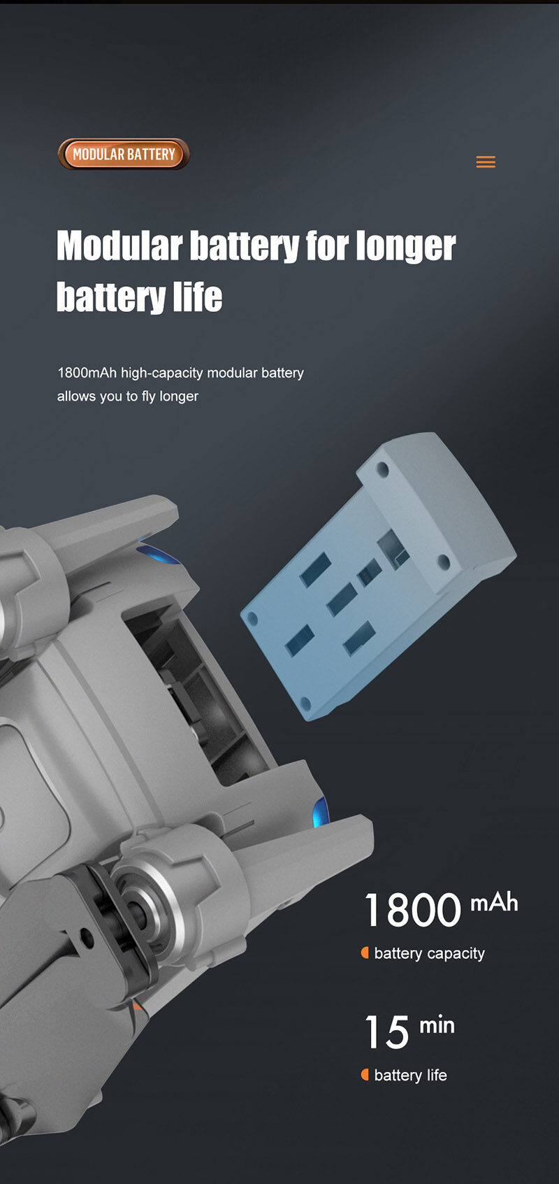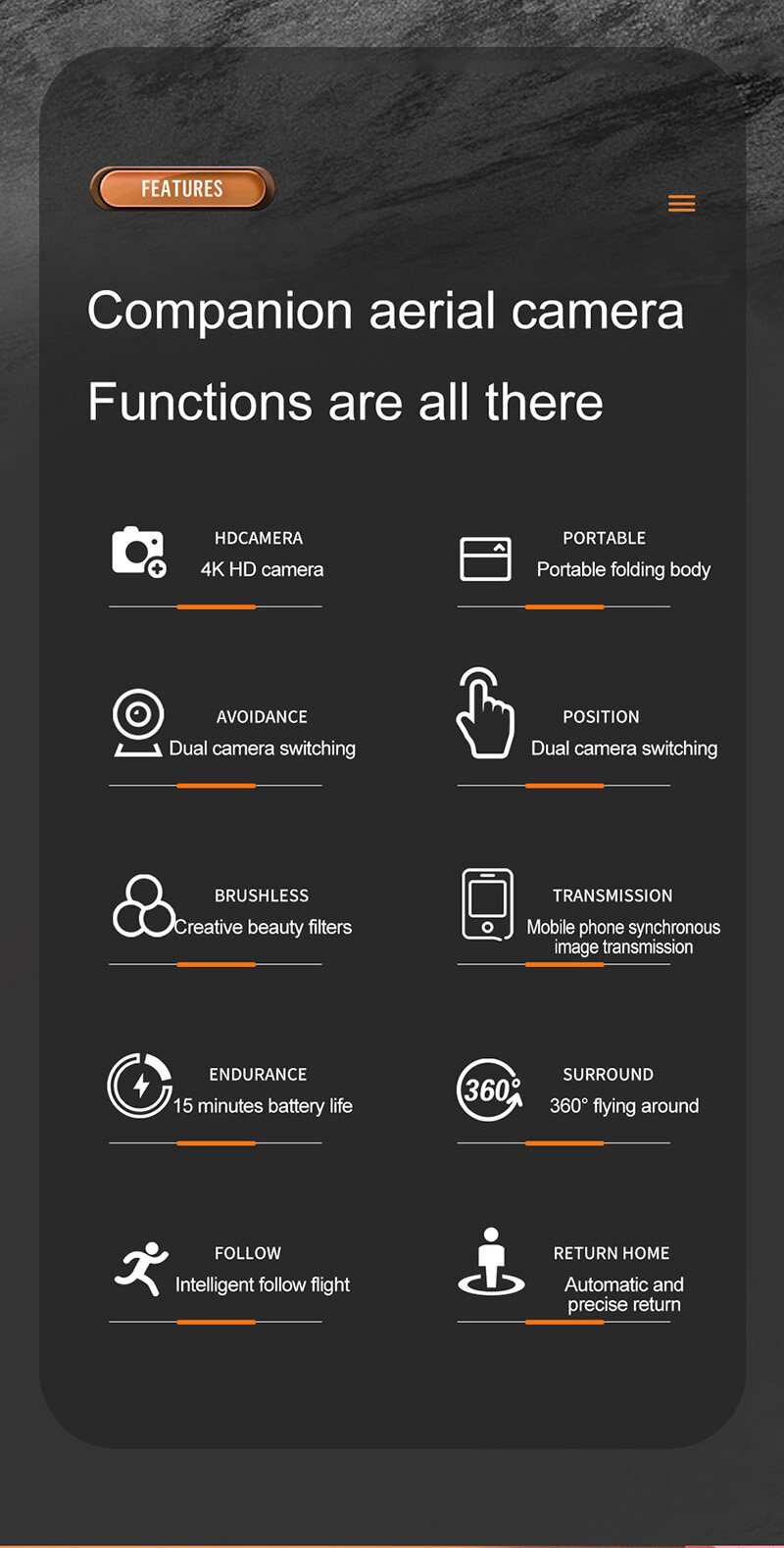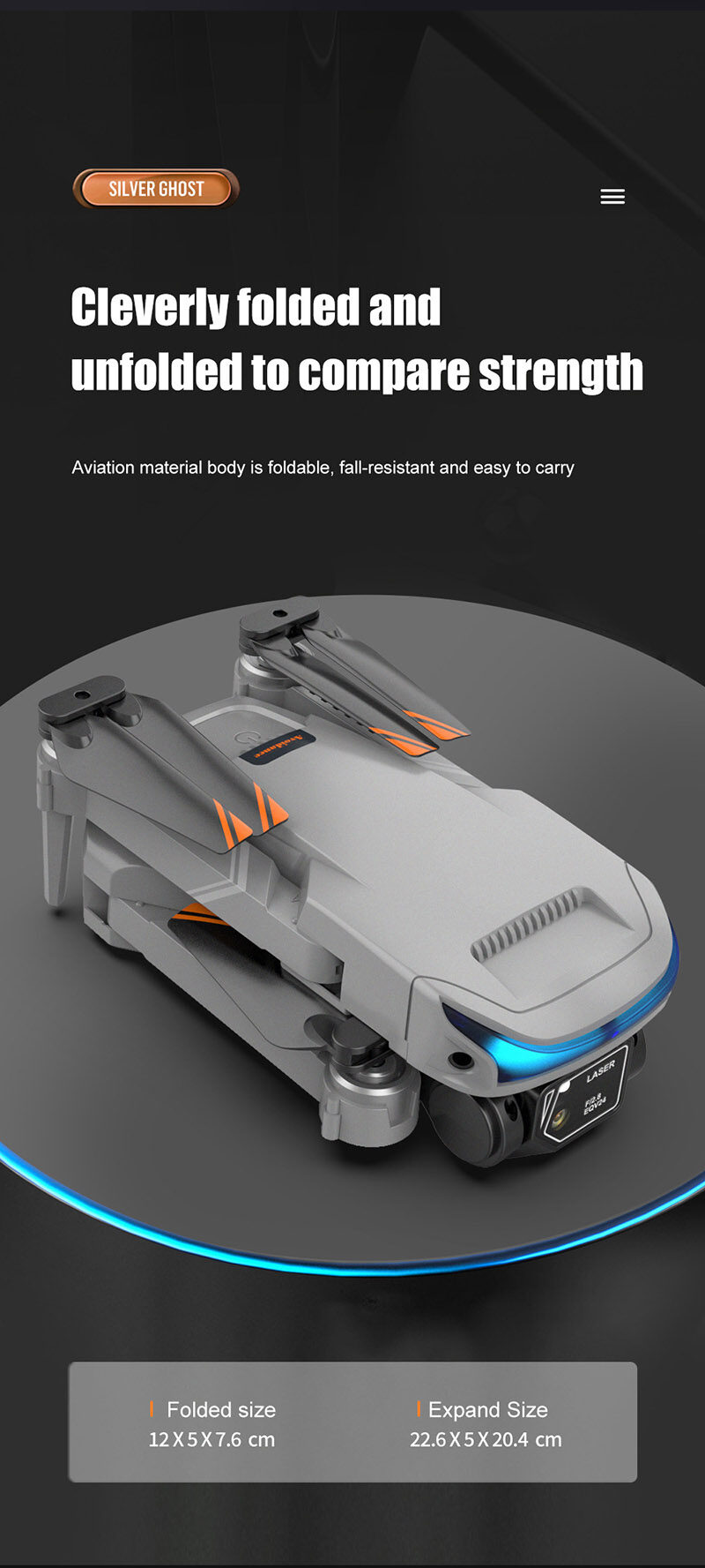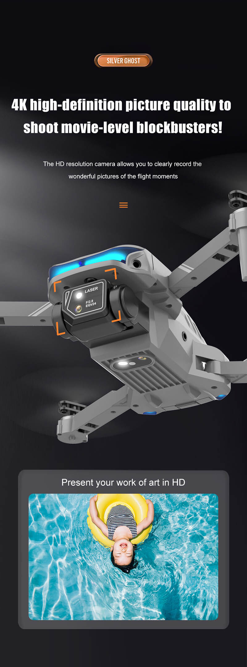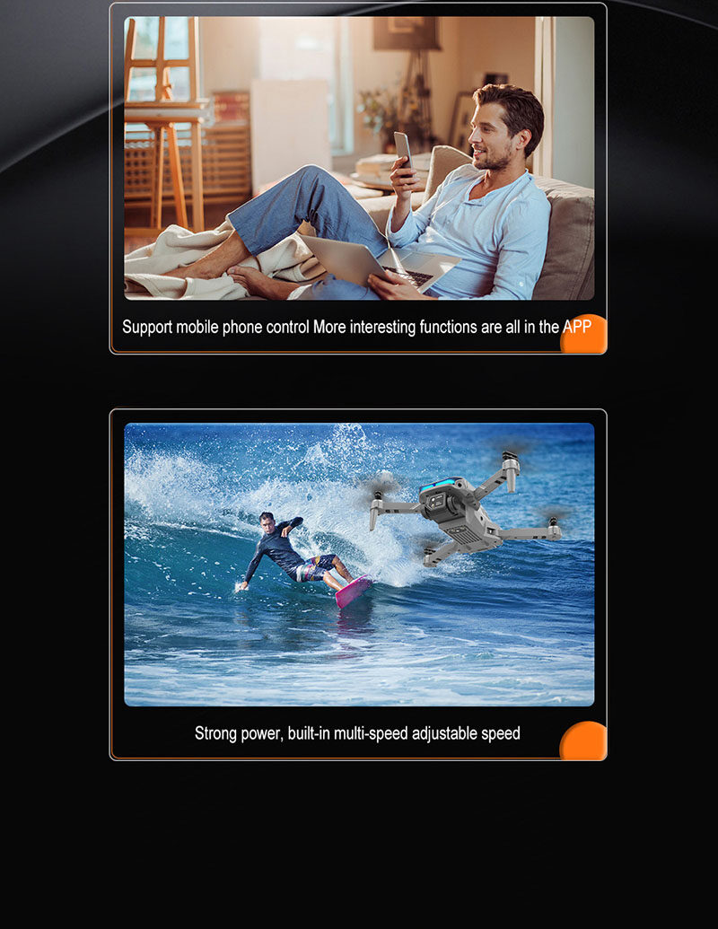 Features: Foldable arms, small size only 13cm, easy to carry. With altitude hold mode function, with Optical flow location and flight is stable. there is no need to adjust the position of the aircraft before flying In headless mode One Key Take-off / Landing / Return. Easily find your way home using the one-button back function. Built-in 4K camera capture stunning pictures and videos from the sky. Dual camera switch, get rid of fixed angle of view. Draw a flight path on the screen, the drone will fly autonomously along the specified path. VR 3D experience. Through mobile app with VR glasses, you can feel the emptiness from the perspective. MV production, music addition. 3.7V 1800mAh modular battery, easy to install and take, battery life up to 15 minutes. 2.4GHz anti-interference technology. 4 channels for ascent, descent, forward, backward, left flight, right flight and 360°roll. Six-axis gyroscope, smoother flight and more convenient control. LED lights make flying more spectacular, especially in the dark.