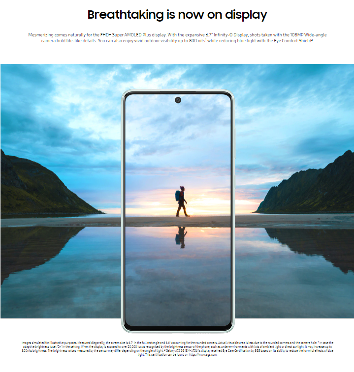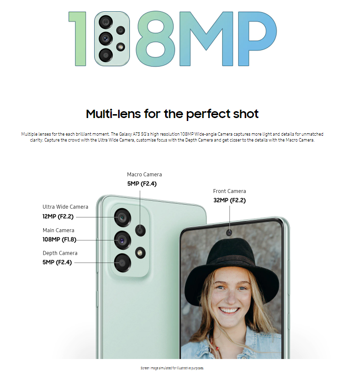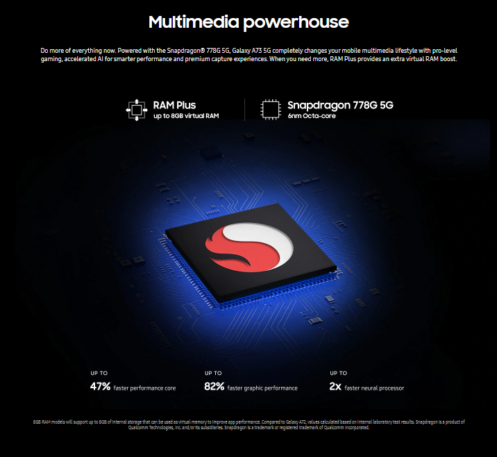 The Galaxy A73 5G uses a 108MP main shooter instead (f/1.8, OIS). Galaxy A73 5G also has a bigger display (6.7-inch Super AMOLED with 120Hz refresh rate), and a better processor (Qualcomm Snapdragon 778G 5G).