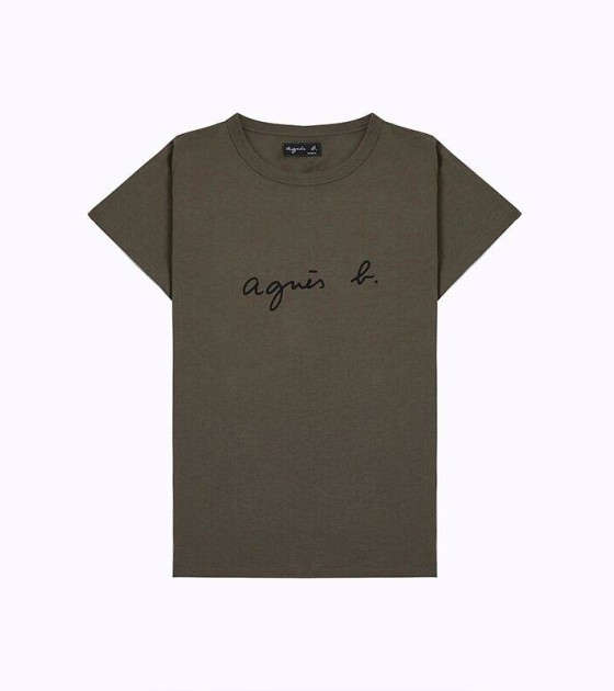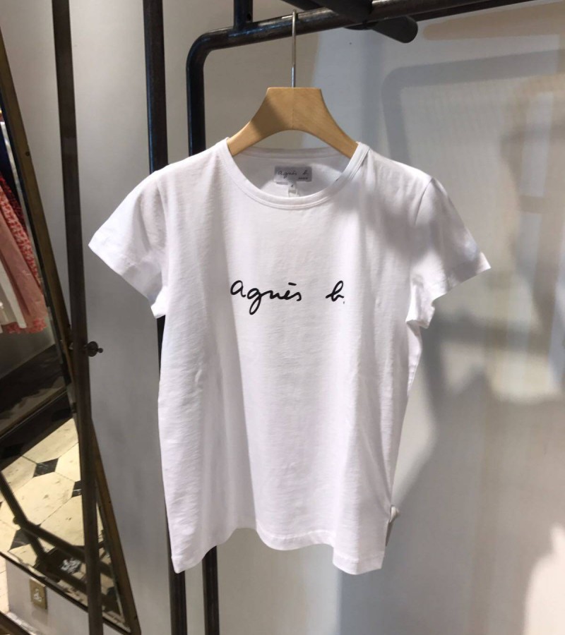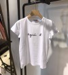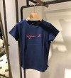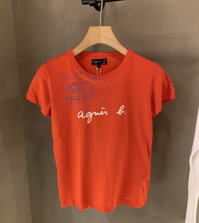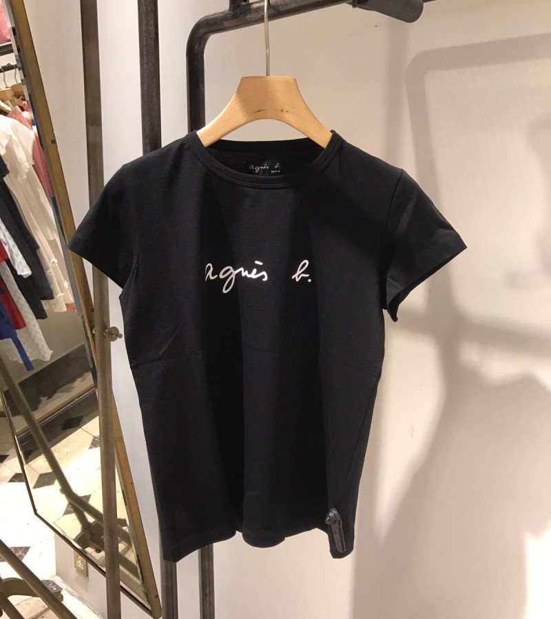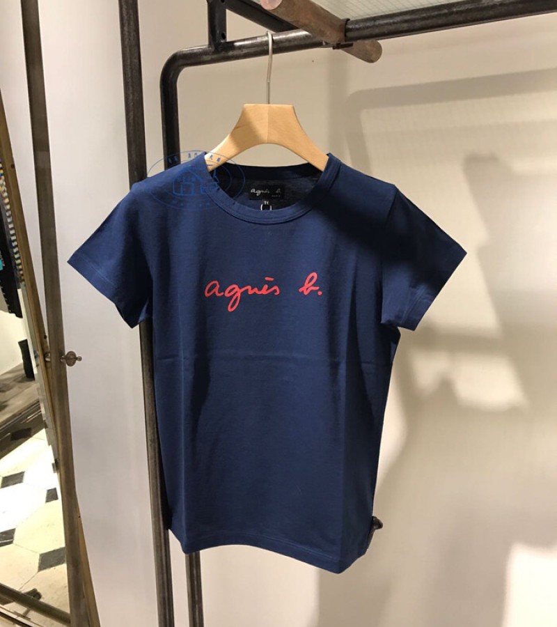 春夏季新款agnes b草书PALEESIJA字母纯棉短袖T恤深蓝色女装